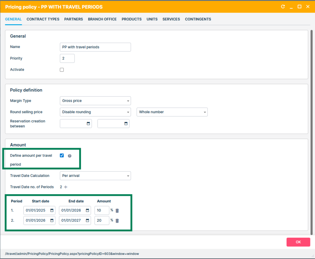 A redesigned pricing policy model now allows defining multiple travel periods, each with its own margin percentage, within a single pricing policy. If travel periods are not used, the system behaves as before, with slight UI changes.