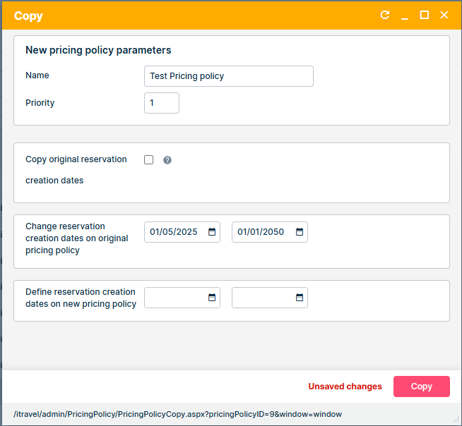 Previously, when copying a pricing policy, Reservation creation dates were always copied from the original policy. Users had to manually edit dates afterward, increasing the risk of errors and unintentionally applying the new pricing policy to existing bookings.