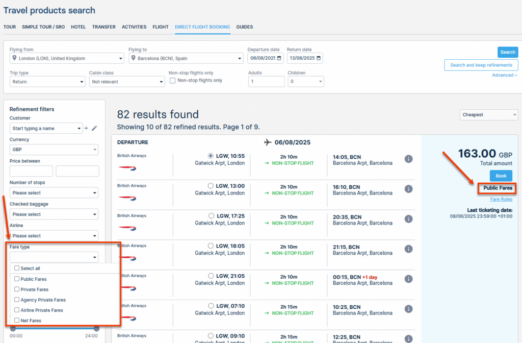 Fare type visibility is now implemented when booking Galileo flights. Each flight result in the UI clearly displays its associated Fare type—Public, Private, Agency Private, Airline Private, or Net Fare—and users can filter results based on these Fare types directly within the search interface.